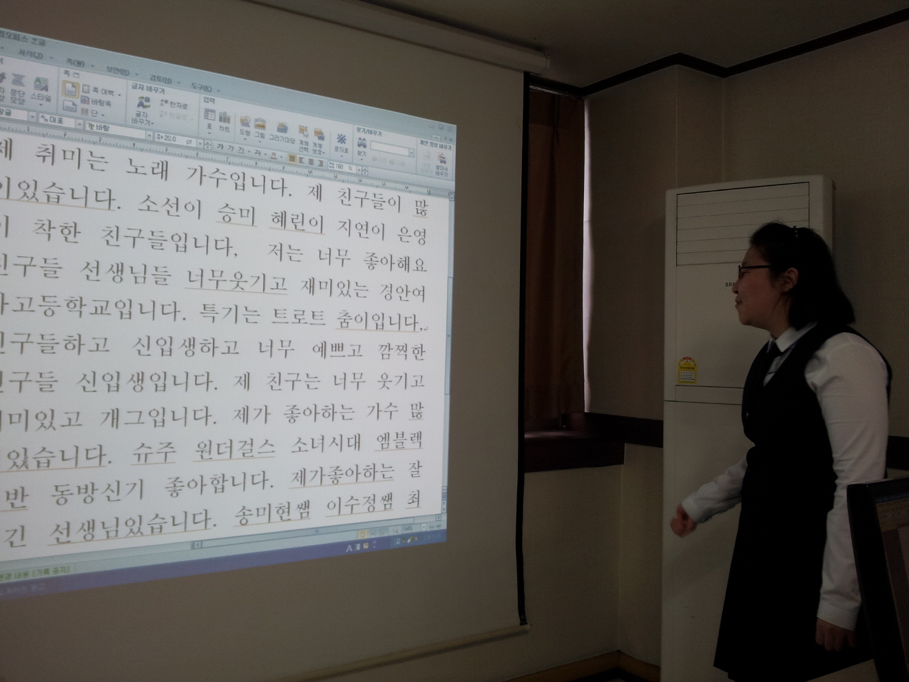 나를 알리는 광고지 작성 후 주영이가 앞에 나가서 발표하기를 하는 모습이에요.